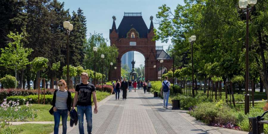 在红色大街和巴布什基纳大街(Babushkina St.)的交叉口,矗立着宏伟的凯旋门,又被称为“皇室大门”。它于皇室家庭抵达叶卡捷琳娜达尔到来之前建成。请注意:现在的凯旋门只是以前老凯旋门的复制品,老凯旋门在苏联时代已被毁掉。